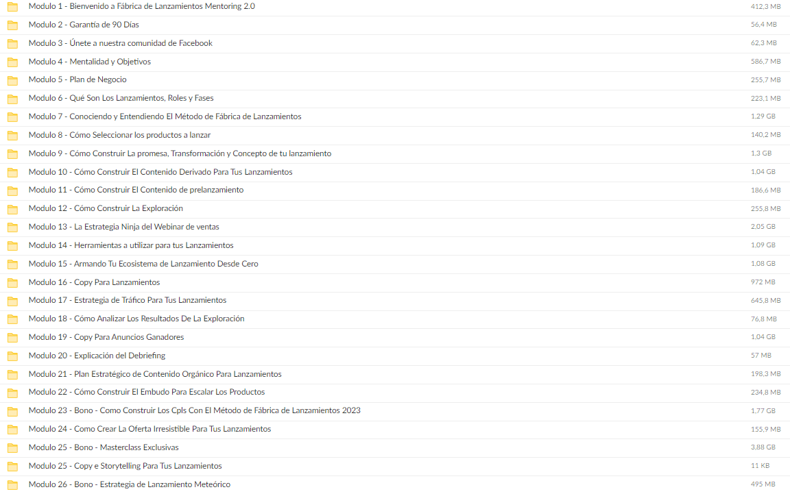 Fabrica de Lanzamientos Mentoring 2.0 es un curso completo con acceso inmediato desde tu cuenta. Aprende con un método claro y práctico, paso a paso, para dominar este tema desde cero y avanzar con resultados reales.